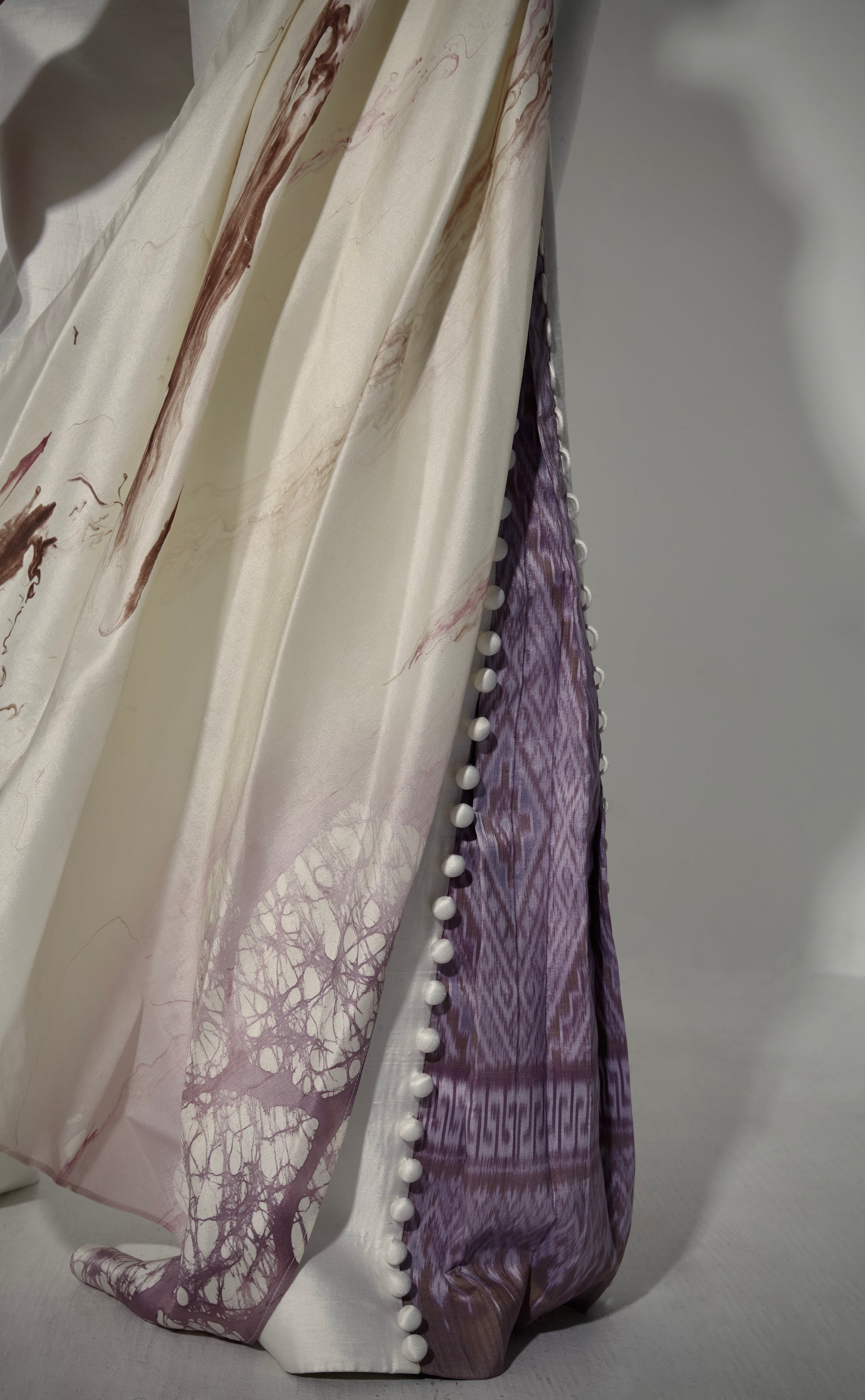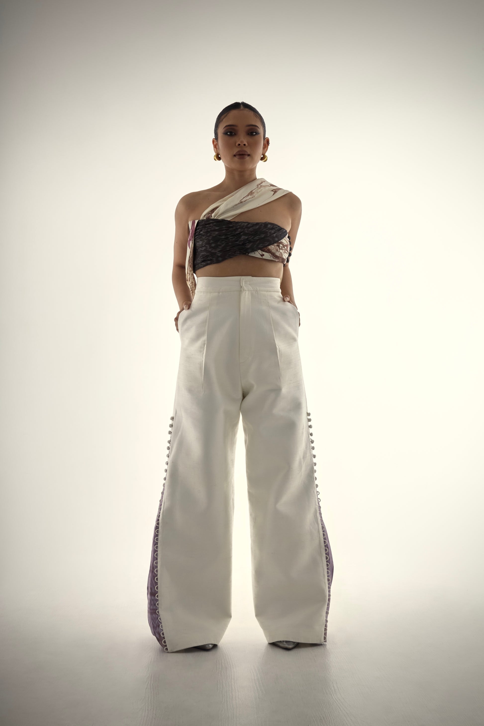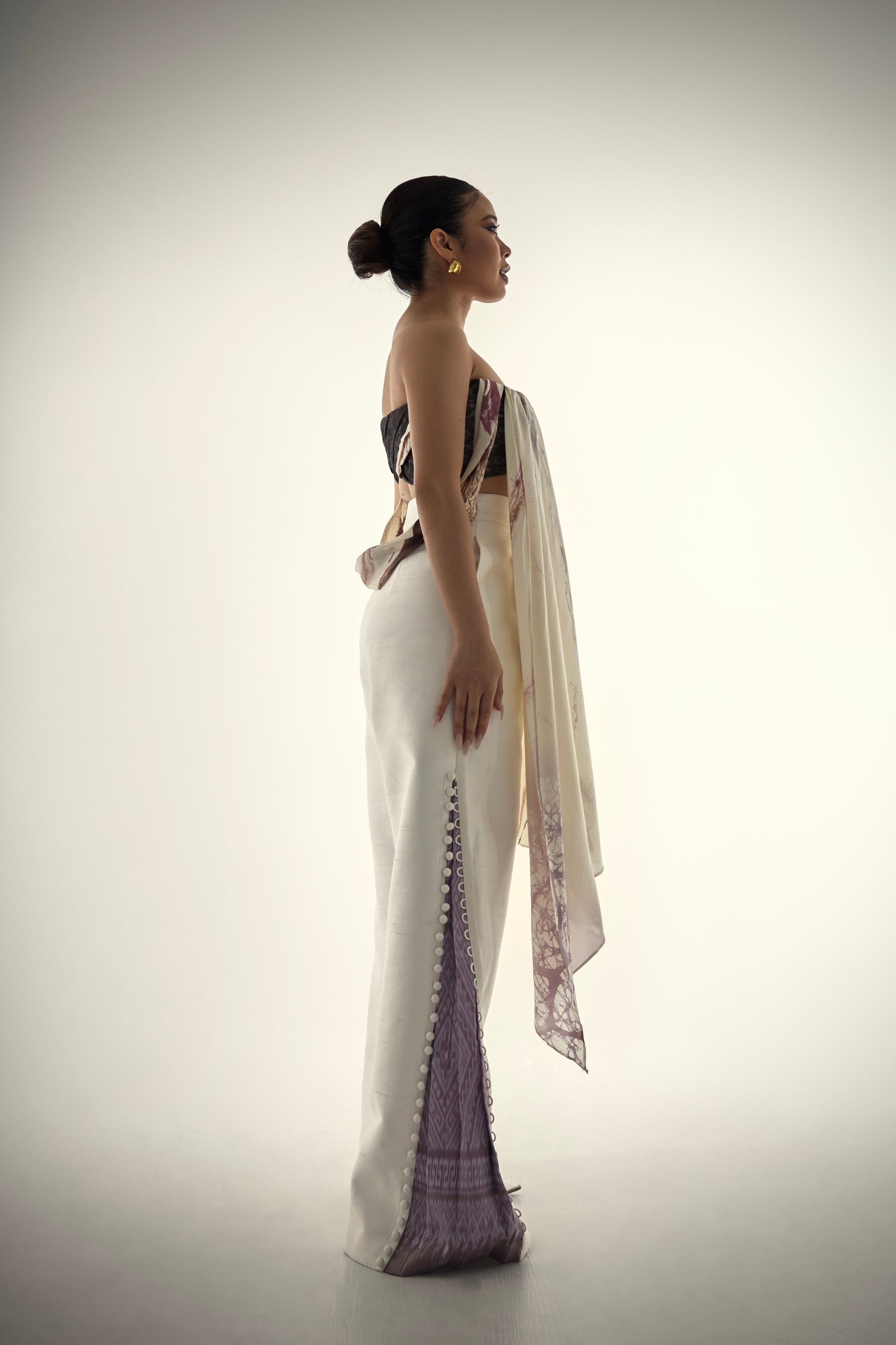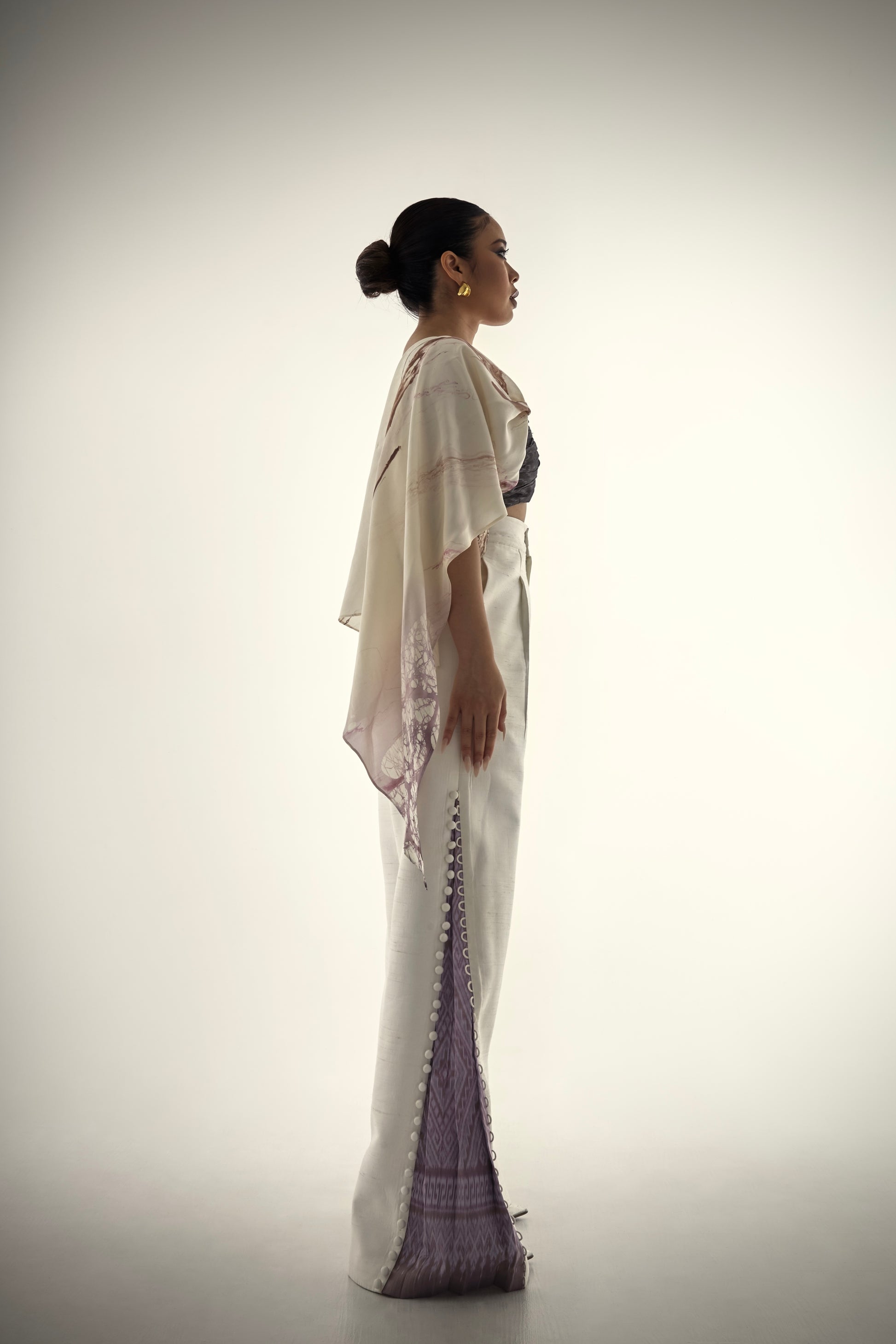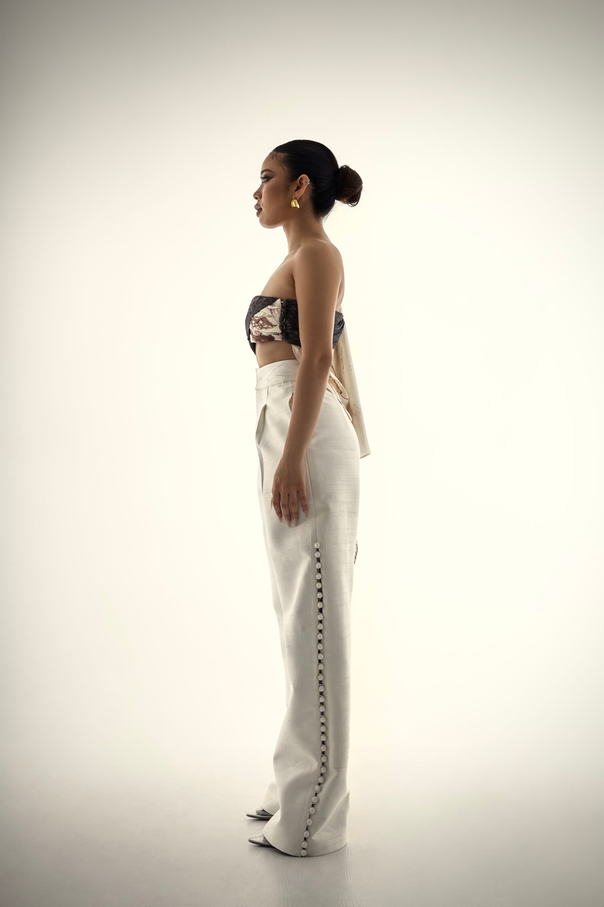Elevate your wardrobe with our exquisite long white 100% Thai silk trousers. Crafted with meticulous attention to detail, they feature unique side buttoned designs that conceal vibrant patterned silk underneath, drawing inspiration from deconstructed pleats on traditional Thai garments. Versatile and chic, these trousers can be worn buttoned up for a sleek look or opened to reveal the captivating patterned silk, adding a touch of flair to any ensemble. Experience luxury and style like never before with our Signature Trousers, incorporating covered buttoned details drawn from our cultural heritage.